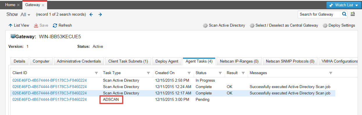The application creates an agent task for the gateway. After the gateway receives the task, the scanning process starts.