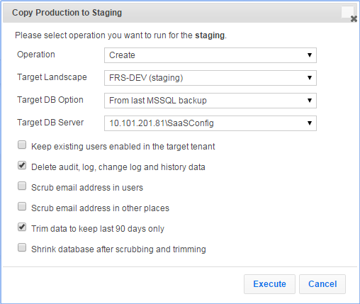 | b. | In the Target DB Option field, select From live MSSQL backup. See Copy Production Instance of the Tenant to the Staging Instance of the Tenant. |