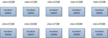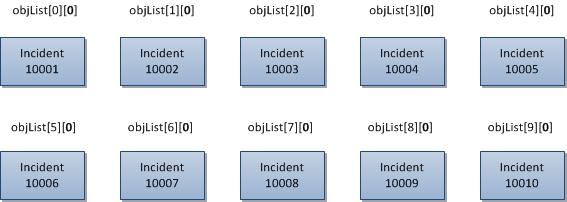 For example, assume the search returns ten incident records. The incident records can be accessed from objList[0][0] through objList[9][0]. The first index in the two-dimensional array changes, but the second index remains at 0.