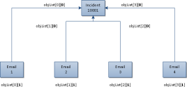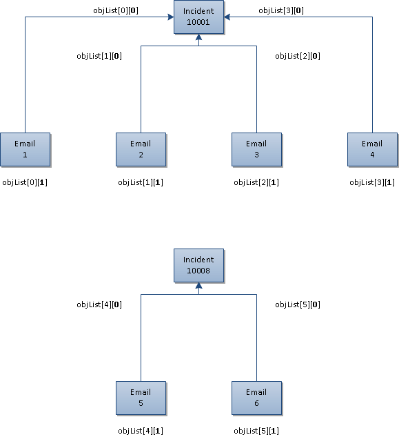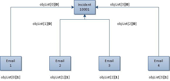 The first incident record shows up using either objList[0][0], objList[1][0], objList[2][0], and objList[3][0], and its corresponding Journal.Email records show up via objList[0][1], objList[1][1], objList[2][1], and objList[3][1].