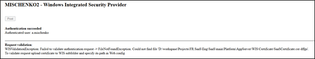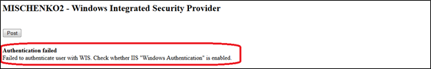 If the authentication request validation fails, the application disables the Post button and you cannot perform external authentication with the Windows Integrated Security provider. An error message appears.