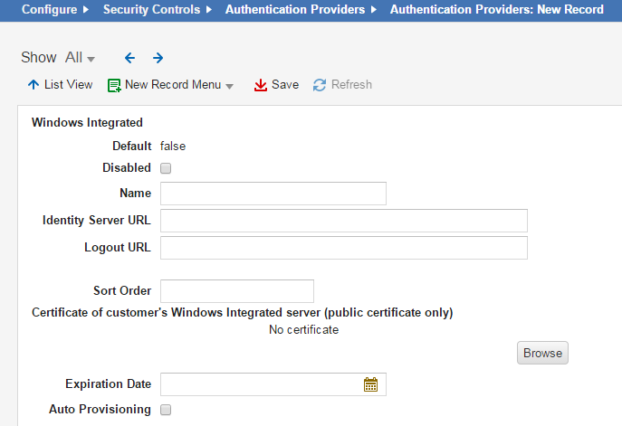 2.Open the Windows Integrated Security authentication provider record. Refer to Working with ADFS/SAML.