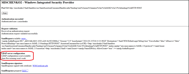 Using Windows Integrated Security in debug mode shows you all configurations used in Windows Integrated Security, and errors that occurred during validation of a SAML request or construction of a SAML response. You can easily determine the cause of failed external authentication using this method.