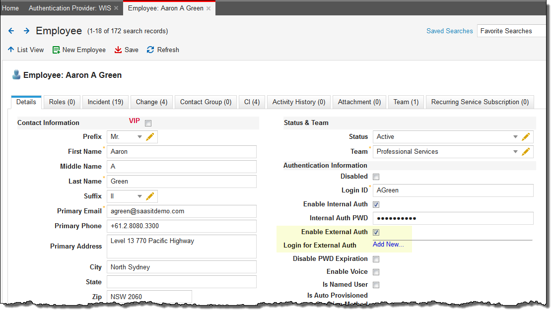 13.Modify an existing employee by enabling External Auth and specifying Login for External Auth as the newly created Windows Integrated authentication provider.