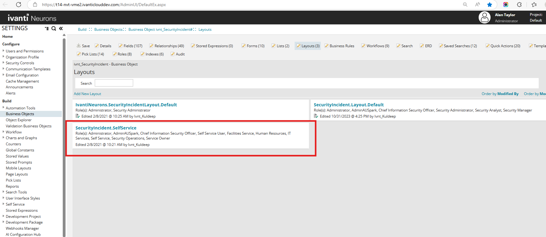 3. In the selected business object workspace, choose the Layouts tab.