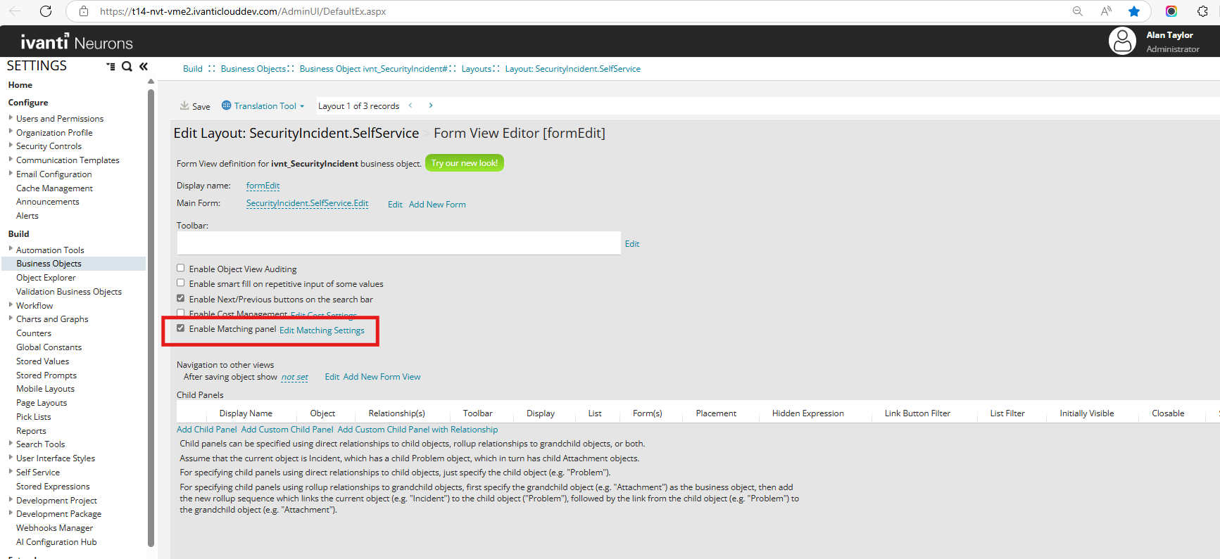 Enabling and Configuring the Matching Panel