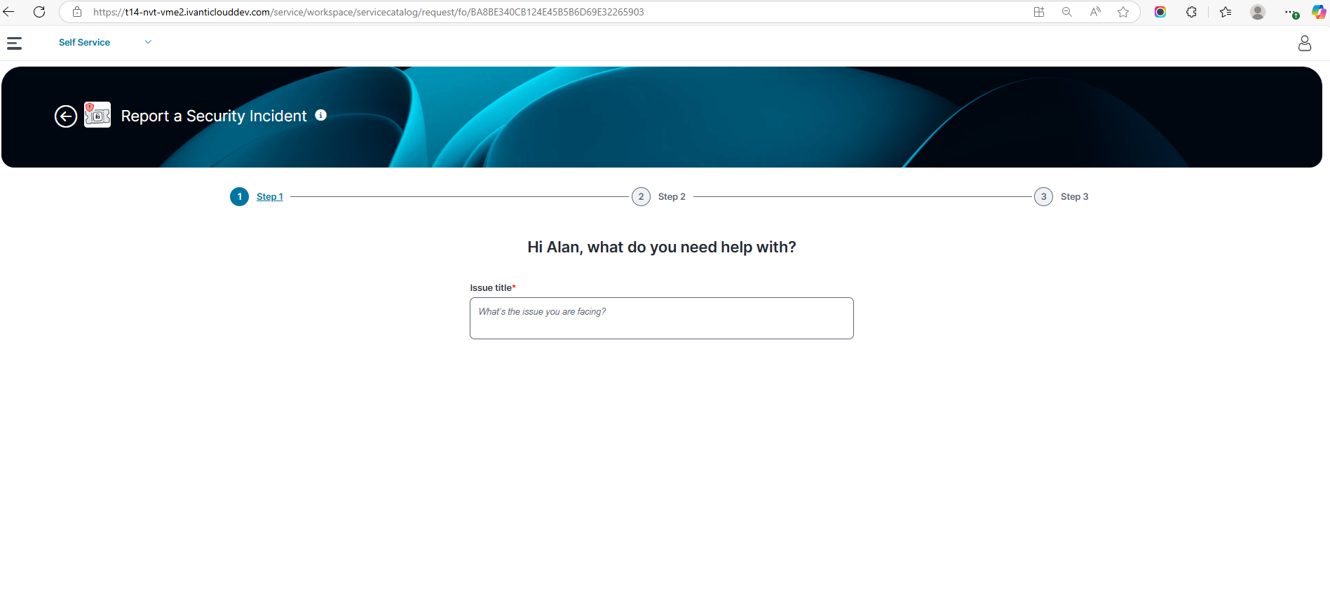 Once enabled and configured, the Self-Service Portal displays Steps 1 and 2 (Help and Resource Matching Screens) before displaying the request form.