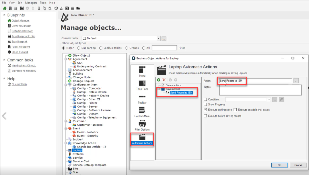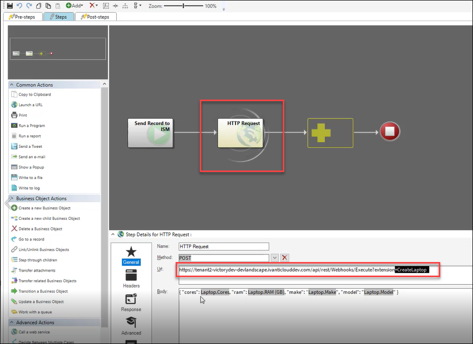 2.In CSM, create an Automatic Action for the Laptop business object called Send Record to ISM. This triggers an HTTP Request One-Step Action to send data to the ITSM webhook.