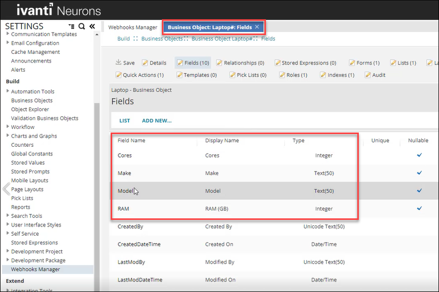 1.Ensure that an identical business object called Laptop exists in ITSM.