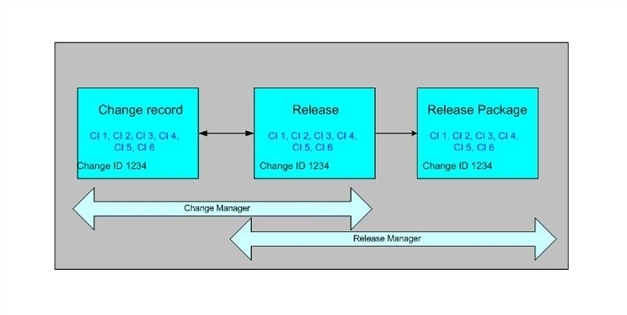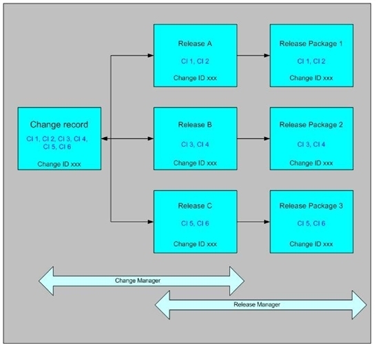 In the following illustration, the change record is linked to multiple releases. Each release is in turn linked to a different release package. The Release Manager links only those configuration items to the release record and release package that will be included in the actual release.