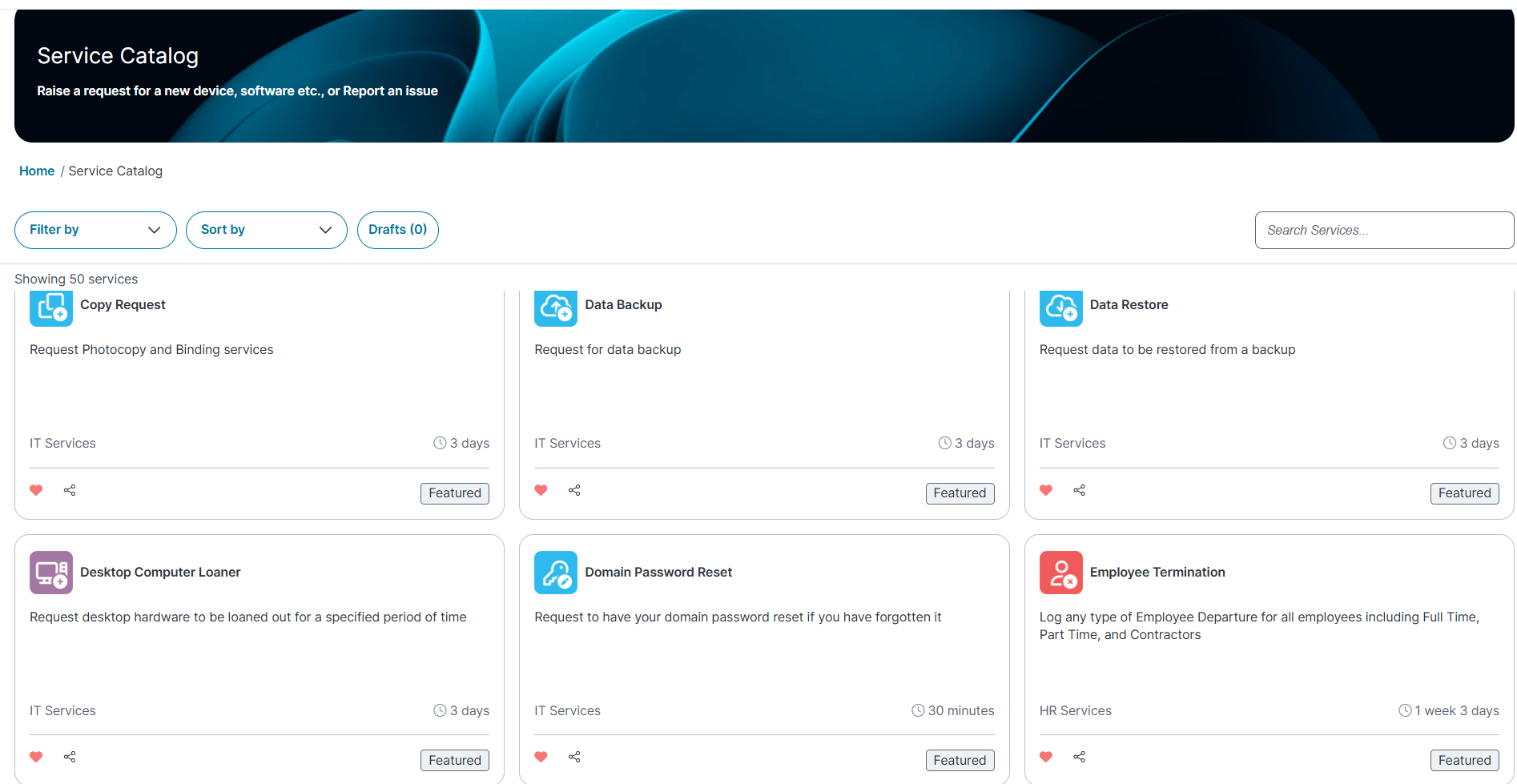Filter by category or presets : Filter Request Offering by department, Most popular, or Favorite (lists Request Offering marked as favorites) or preset to define the category such as (HR Services, Most Popular Request Offerings, New Incidents, IT Services, Facility Services).