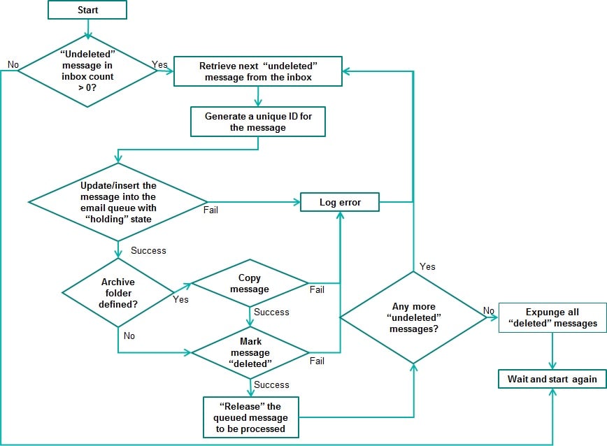 The following flowcharts shows how incoming emails are processed by the email listener: