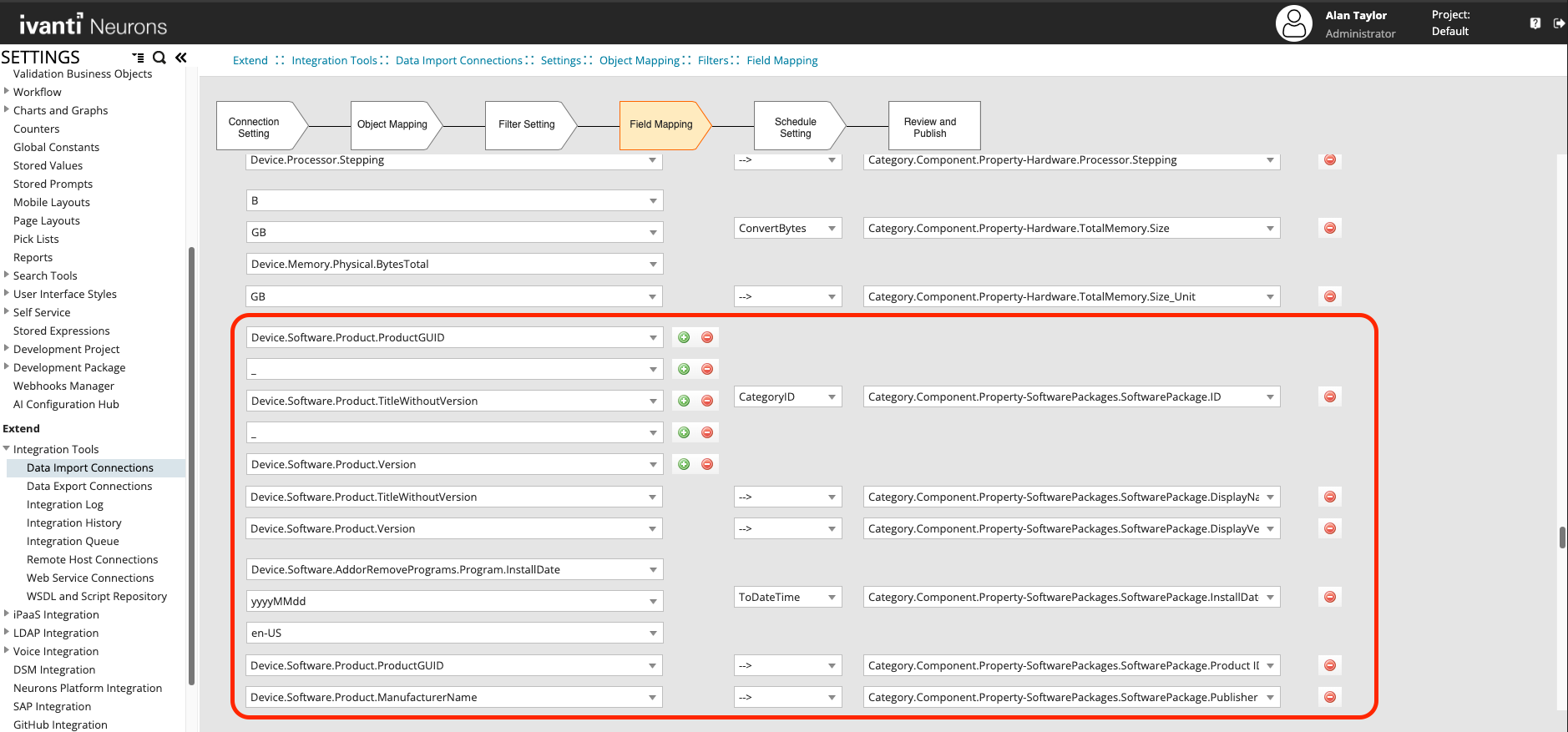 The Ivanti Neurons Connector (Device) supports importing installed software information from Windows, macOS, and Linux (Ubuntu) devices. To ensure complete and accurate software data, configure the field mapping in the Data Import Connection workspace as described below.