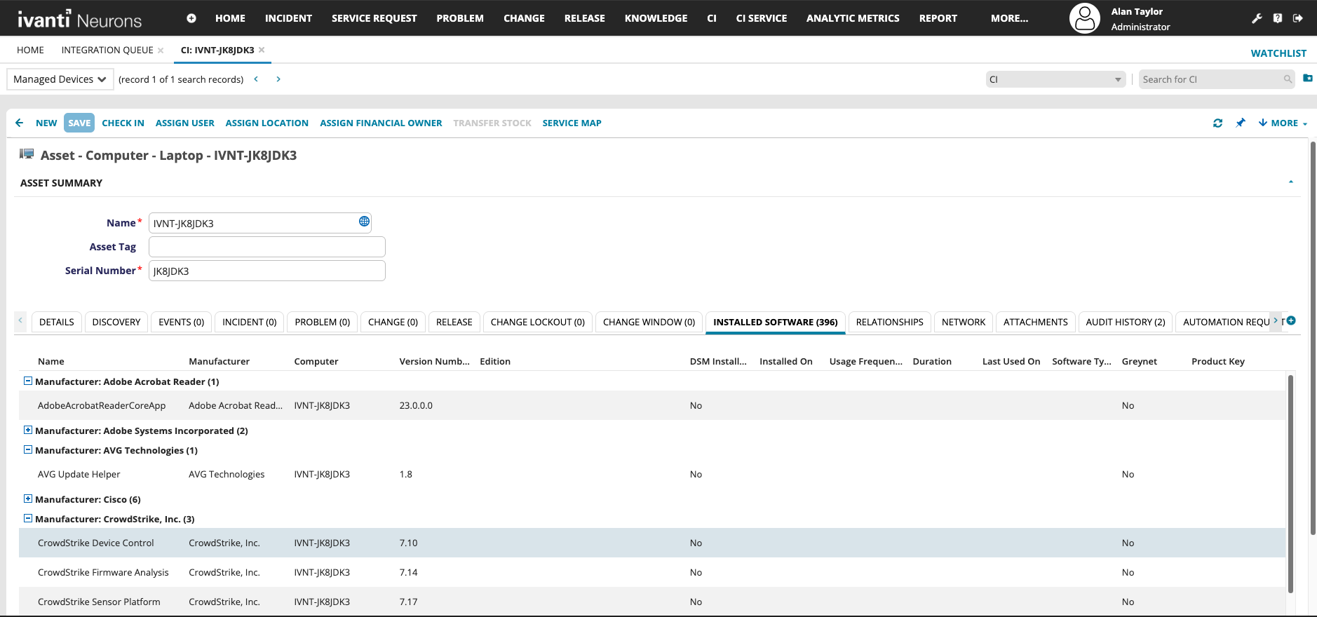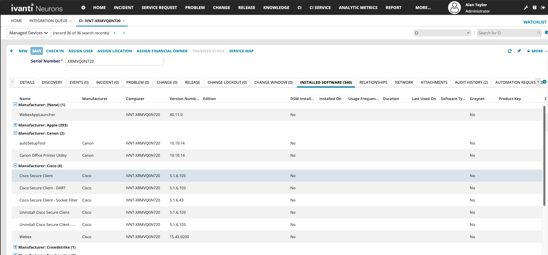After applying the common mapping in ITSM for all device types, you can import devices from Ivanti Neurons. The installed software information for each operating system is updated automatically with accurate values.