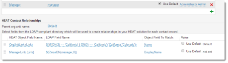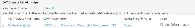 5.Under Neurons for ITSMContact Relationships, choose the parent organizational unit name, or choose Default. Select fields from the LDAP-compliant directory which will be used to create relationships in your Neurons for ITSM solution for each contact record. This relationship must match exactly.