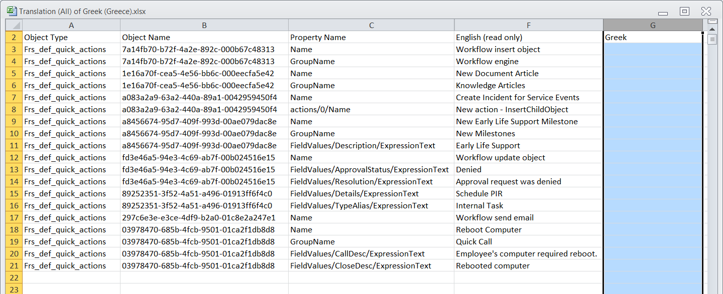 The spreadsheet file name includes the name of the target language. For example, the name might be Translation (All) of Greek (Greece),xlsx