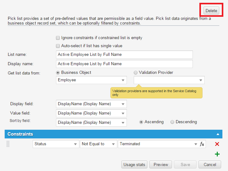 Use caution when deleting a pick list. Business objects using this pick list might no longer function as expected.