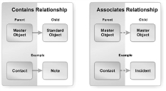 •Contains: The child business object belongs to, and is dependent on, the parent business object. The application loads, saves, and deletes the child business object with its parent business object. These relationships are listed under the Relationships tab.