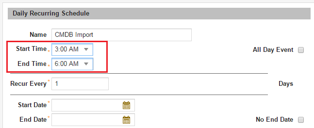 | Recur Every Days | The number of days between each run. For example, to run the schedule every other day, enter 2. |