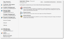 The Application Setup - Request Management page is part of the Application Setup workspace. Use this page to customize how the Service Desk handles request management processes.