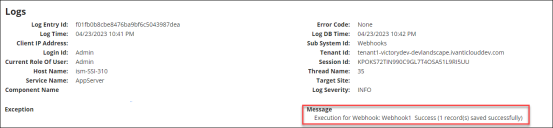 •If a webhook EXECUTE request succeeds, an entry appears in the log detailing that the request ran and how many records succeeded. The Log Severity is shown as INFO.
