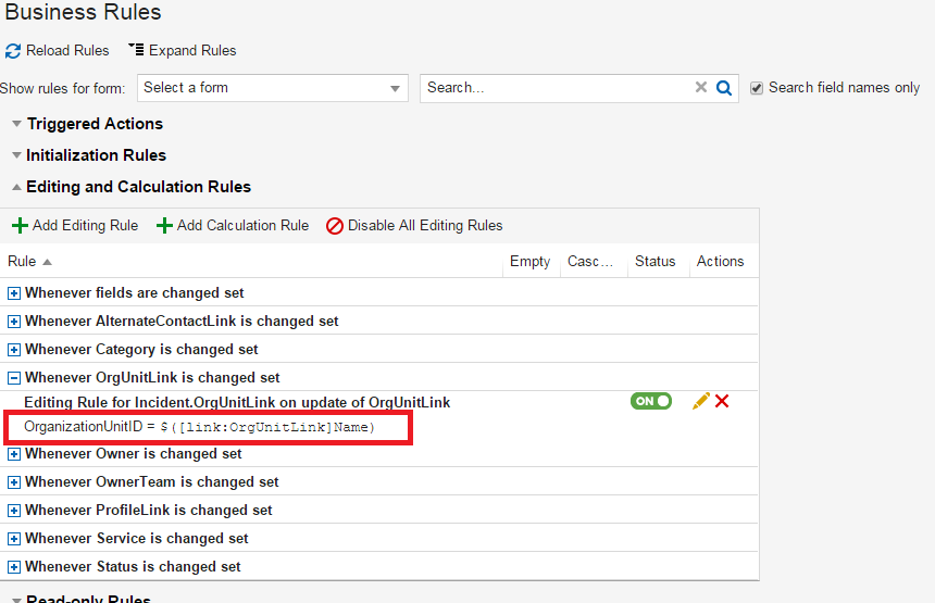 You can also reference a field in the current business object in business rules. For example, the following business rule sets the ActualService field to the value of the Service field in the Incident business object whenever the Service field is changed. The value of the ActualService field is computed by an expression: