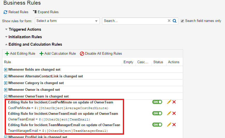 Second, (with the OwnerTeam field validation in place), define an editing rule against the OwnerTeam field in the incident, so that when this field is changed, the rule returns the field value of the validated business object (that is, the other object). See the following example: