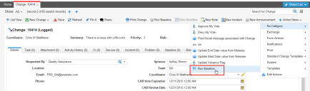 You can only view the baseline of a configuration item type for which the Under Change Control option has been selected by the administrator. Also, ensure that the Change Control option is selected on the Details tab of the configuration item record. If the configuration item type business object does not have the Under Change Control option selected in the Configuration Console, you will not see the Change Control option on a record of that configuration item type.