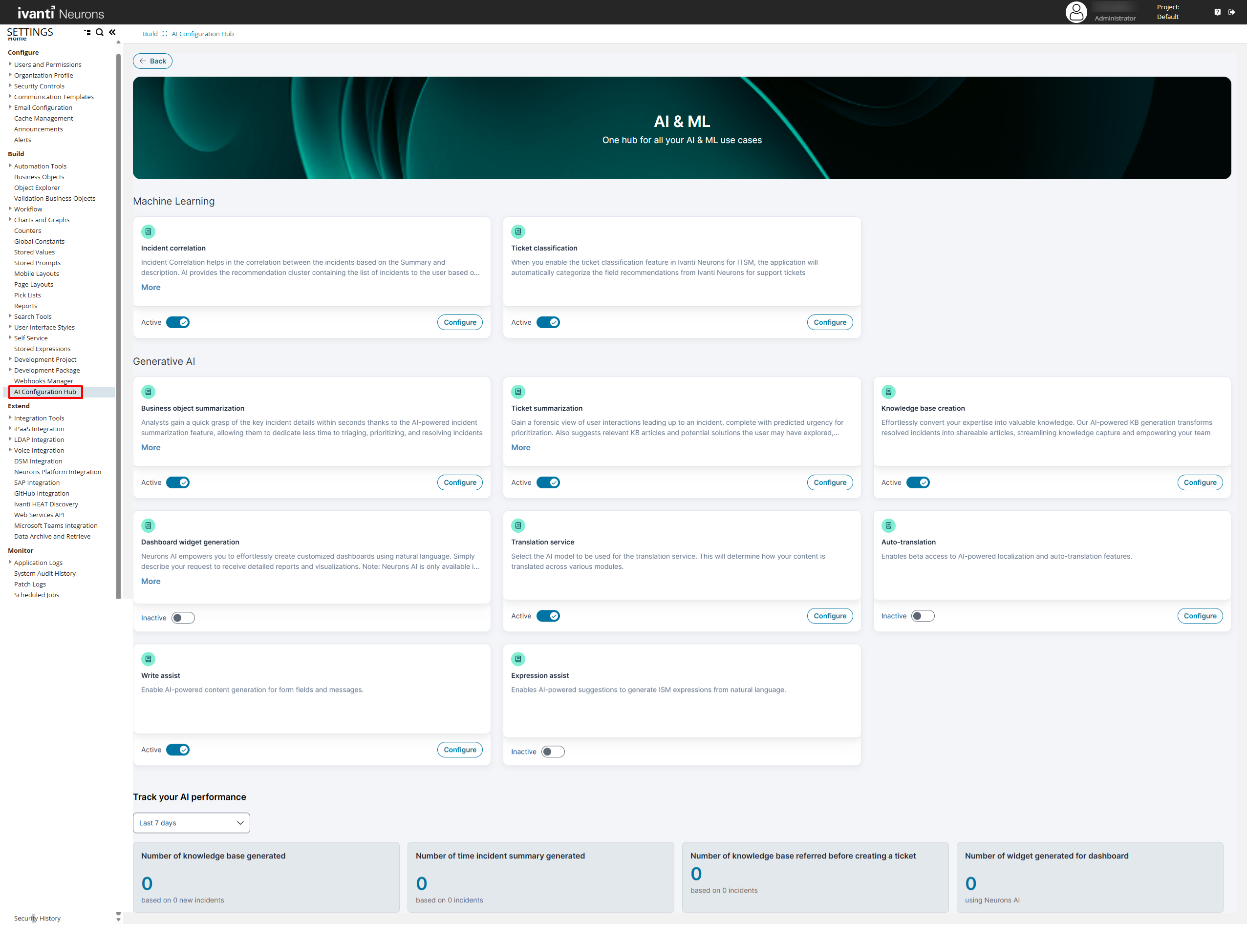 The AI Configuration Hub is a centralized AI ITSM workspace where you can manage all AI capabilities within Ivanti Neurons for ITSM. This hub provides configuration options for advanced features such as the AI content generator, knowledge base AI, and intelligent automation tools that enhance your IT service management experience.