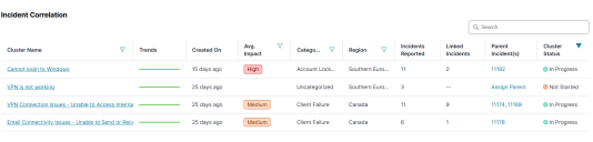•Cluster Name - Clickable; opens the Cluster Info page where all the incidents in the cluster is displayed with options to link/unlink incidents and assign parent incident.