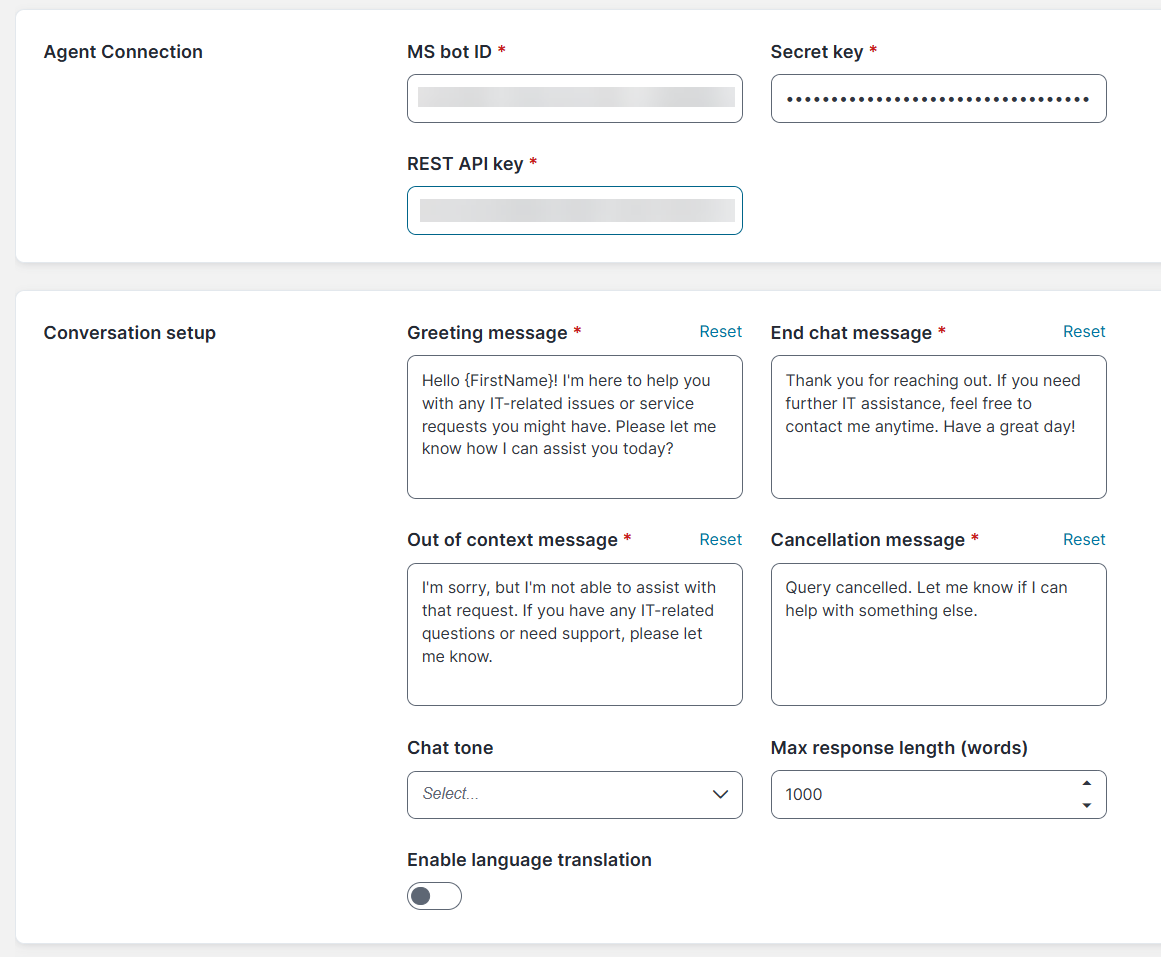 Enable language translation: Click the toggle button to enable language translation. When enabled, the agent will reply in the same language used by the user.