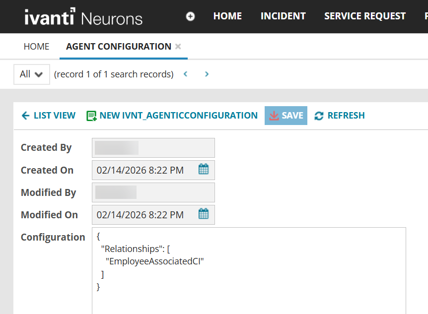 For the agents to understand the relationship between an employee and CI, you must configure the relationship information in the Agentic configuration workspace as well.