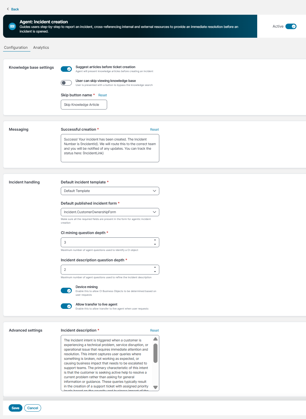 To view the performance metrics and usage statistics for your Incident creation agent, open the Configuration console and select AI Configuration Hub > Agentic AI > Agent Settings > Incident creation agent > Configure > Analytics.