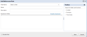 Rules that are executed just before a business object is saved. These business rules usually populate a field.