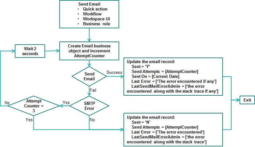 To ensure that outgoing emails reach their recipients during application exceptions, email processing includes the following: