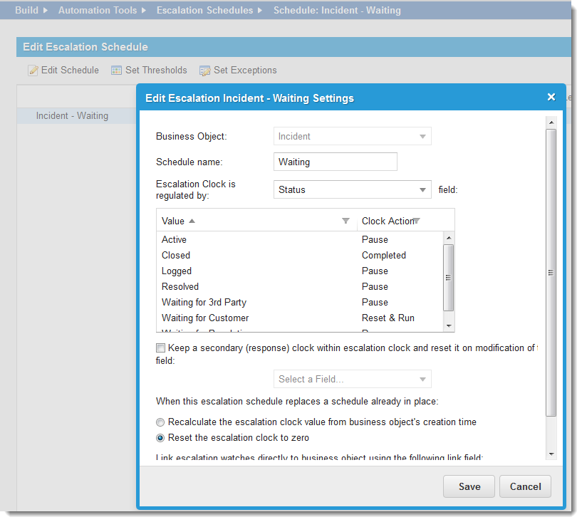 For example, the Incident Waiting escalation is based on the Incident Status field.  It sends a reminder email to the customer after 14 days, and it closes the incident if the customer does not respond to the request for information after 28 days.