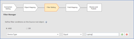 The Filter Manager in IN connector (Ivanti Neurons Connector- Device) enables filtering inflow of device types based on the filter criteria. For instance, an Administrator can select to import an Asset Type “Laptop” only by creating the filter value as “Laptop” as shown below: