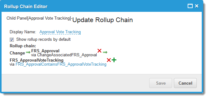 5.From the Child Panels area, click the object of the child panel for which to define a rollup. For example, FRS_ApprovalVoteTracking (next to the Approval Vote Tracking area).