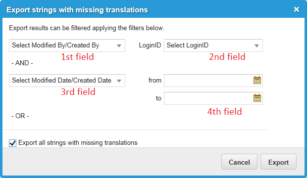 | a. | In the Export Since column of the Languages workspace, click Export next to the target language to export. The application displays the Export strings with missing translations dialog box. |