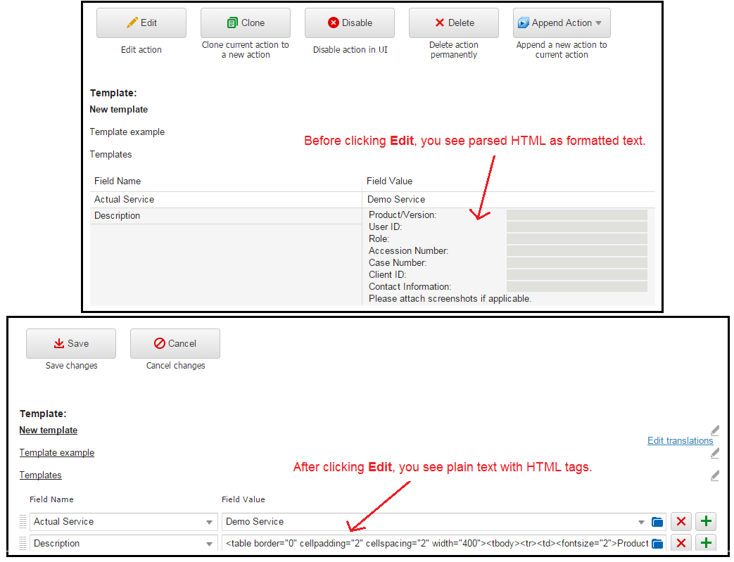 However, when you click Edit to edit the action template, you see plain text, with the HTML tags.