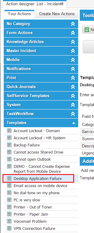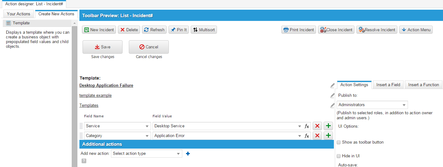 A powerful use for an action involves creating a template, which is a record with several fields already completed by default. An example of such a template is the Desktop Application Failure template, used to create incident records when such failures are reported. You can create such a template as part of a form action.