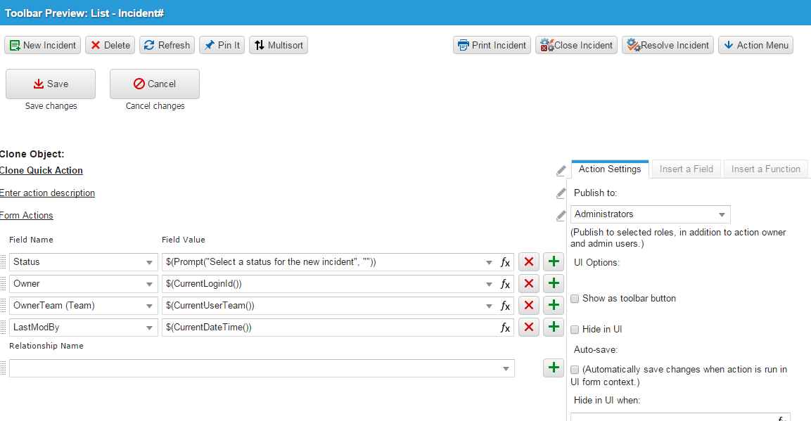 Use the Clone Object Quick Action to copy and overwrite specified fields from a business object record. This example will use the Clone Object Quick Action to clone an Incident record in the Incident Workspace while updating values for various fields: