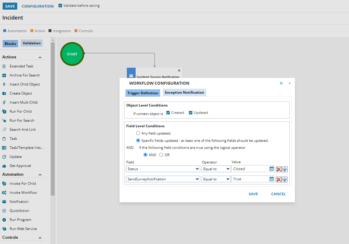 | e. | Ensure that there are two fields and they have this information: Field = Status, Operator = Equal to, Value = Closed and Field = SendSurveyNotification, Operator = Equal to, Value = True. |