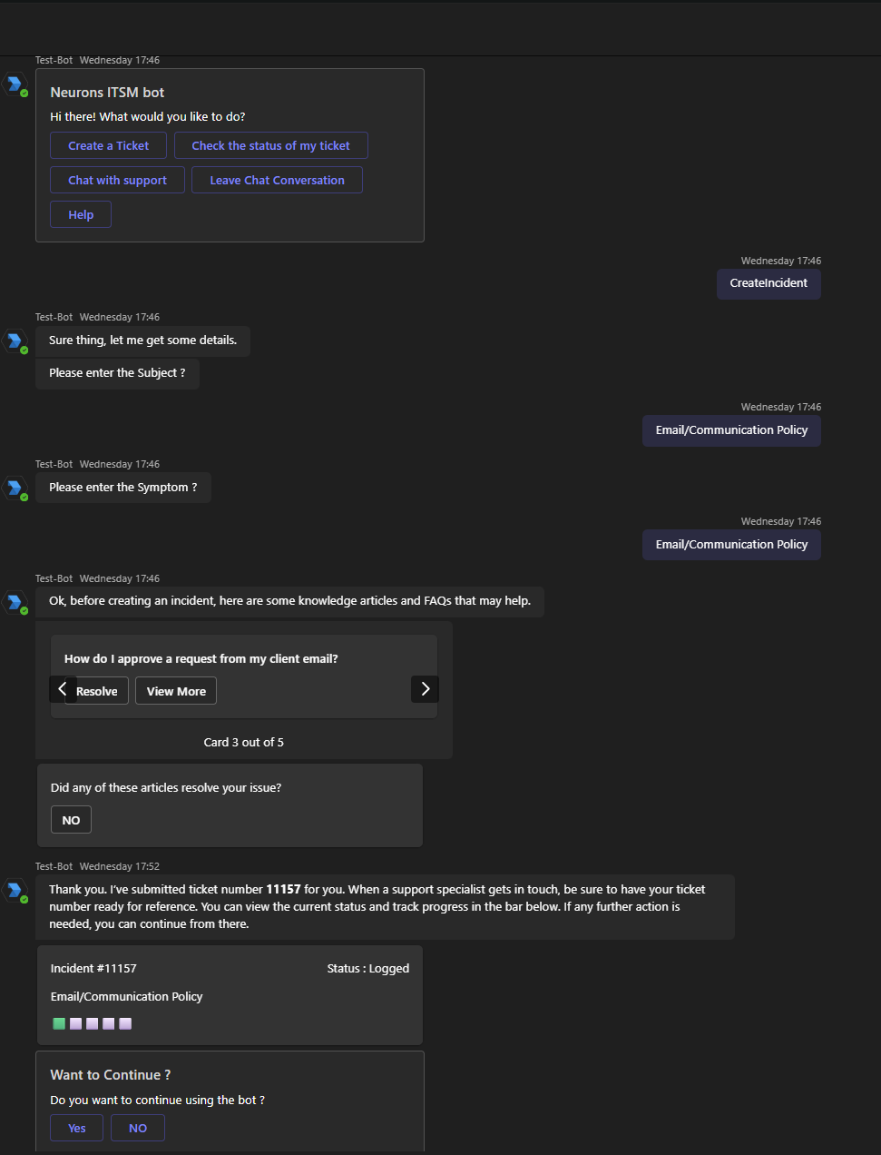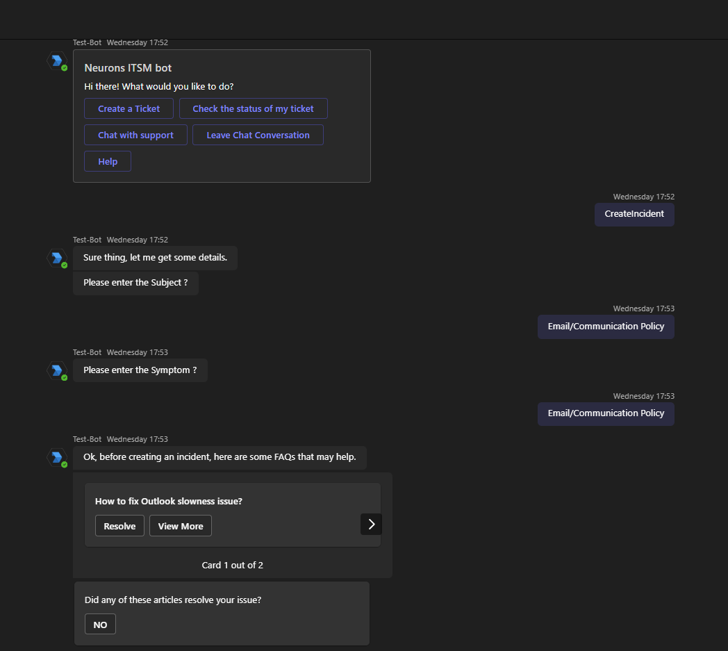 Neurons for ITSM seamlessly integrates with Microsoft Teams Bot to create a custom Teams app. This enables Self Service users to chat with Service Desk Analysts, create incidents, submit customized service requests, and check the status of their tickets from the Teams app. This enhanced integration improves user experience by streamlining ITSM interactions directly within Microsoft Teams.