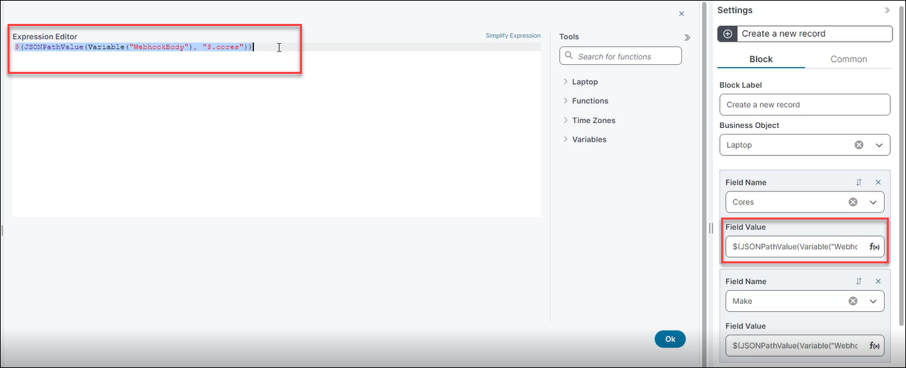 5.Create a new block using the Create a New Record block type and then create an expression using the Simplified Expression Editor to use that variable to populate the fields. Use this expression: