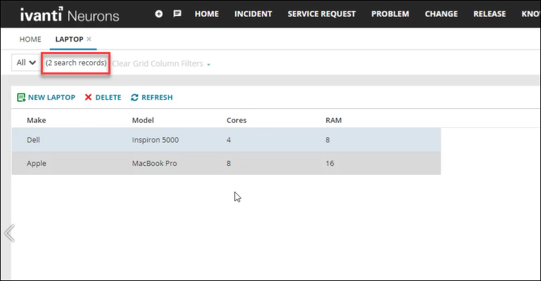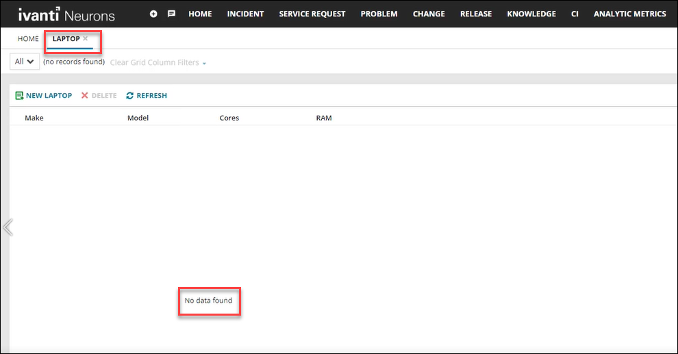 1.To see your webhook in action and/or test it, check there are no records in ITSM for your Laptop business object: