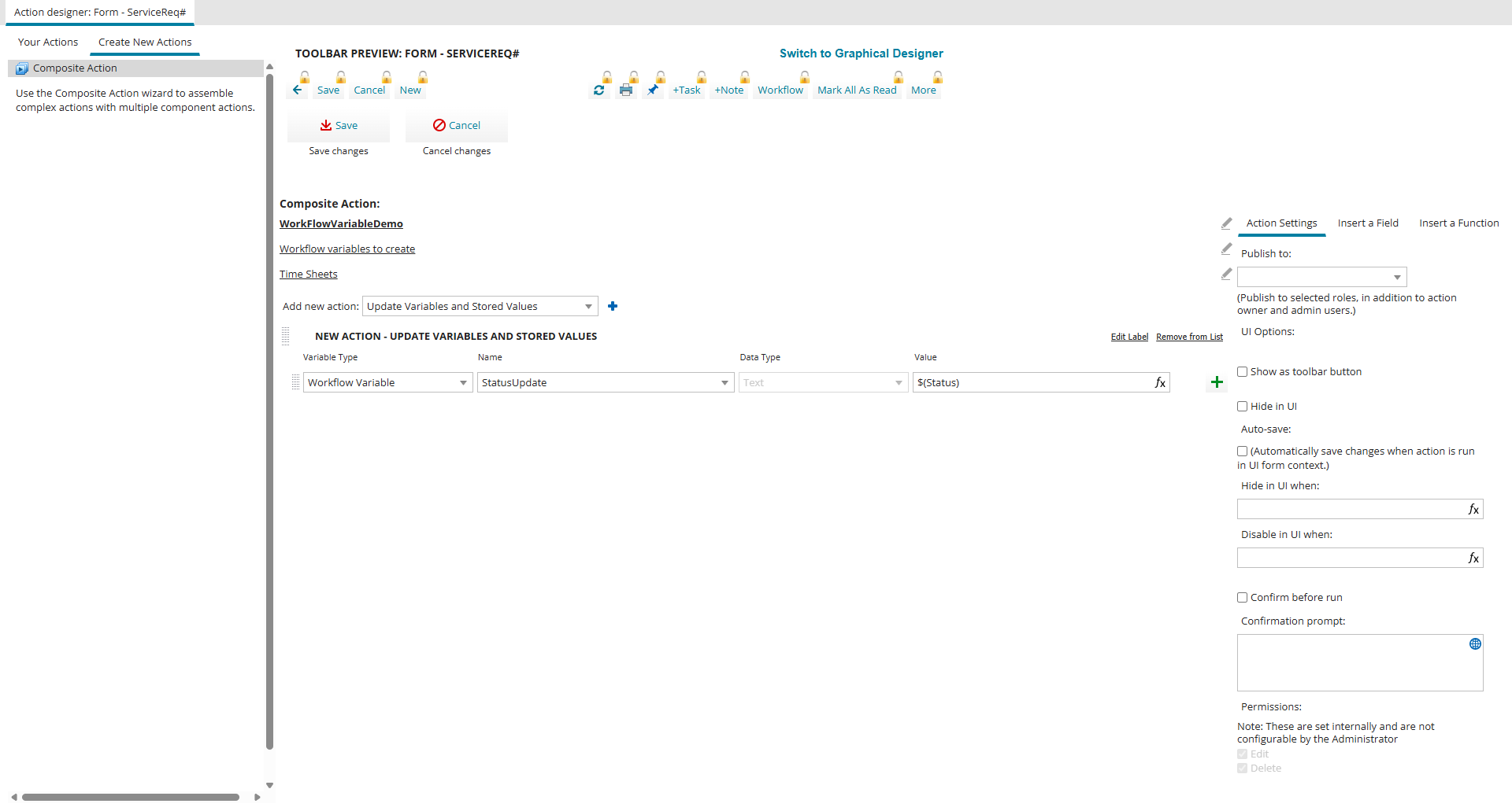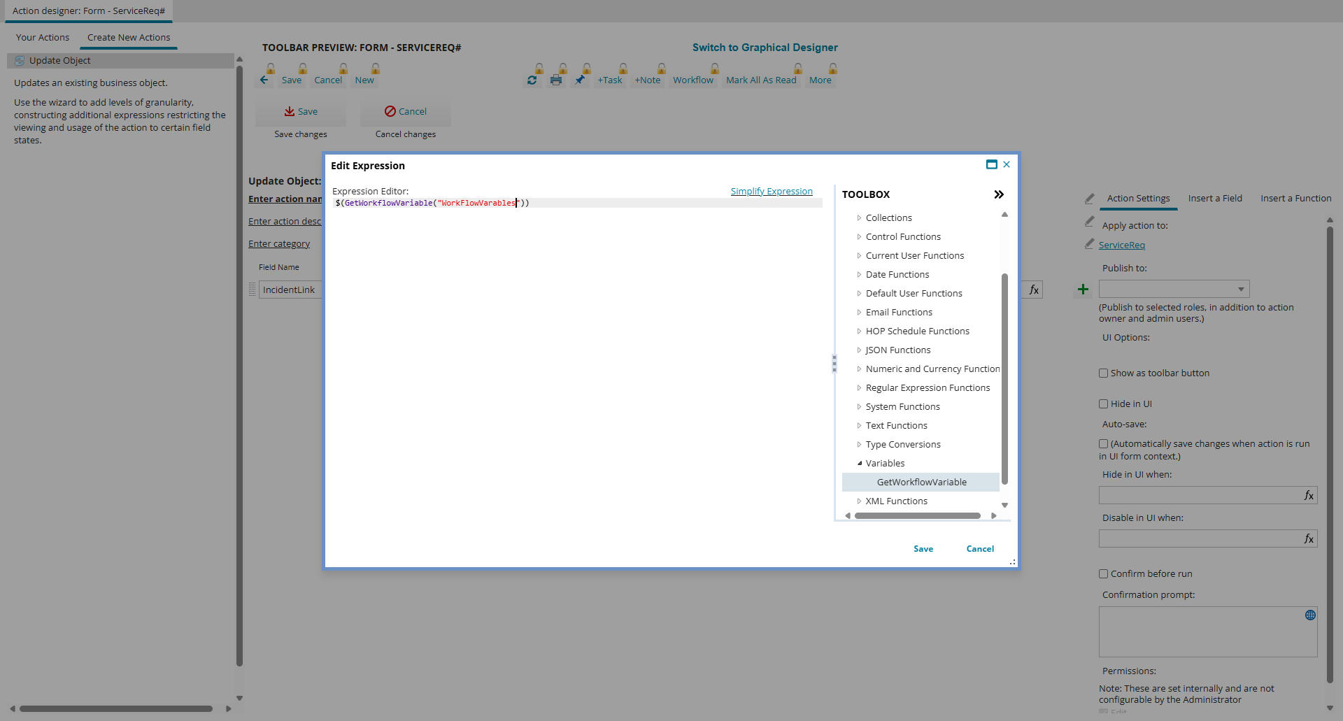 2.Open an Incident or Service Request. From the More menu > Edit Actions > Graphical Action Designer or Classic Action Designer.