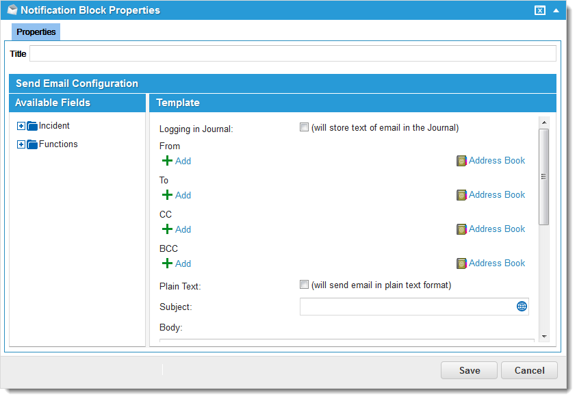 Use the Notification workflow block to define settings for emails. You can create automated messaging within the body of the email message as well as designate the recipient individuals and teams.