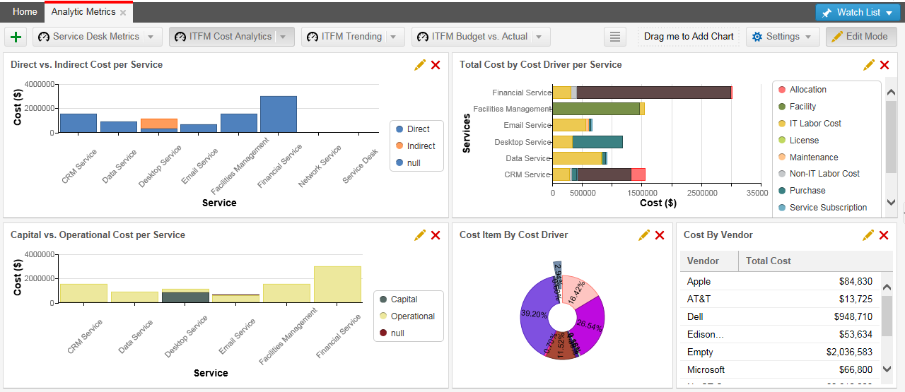 You can track and visualize Neurons for ITSM information, such as cost, value, and consumption. Analytic metrics display your data graphically and allow you to chart both current data and trends. The charts are flexible, customizable, and easy to modify.