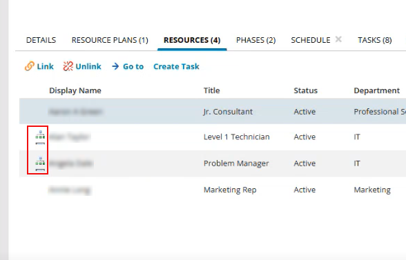 In the Resources tab of the project workspace, child resources that are rolled-up from the Project Phase and Resource Plan are marked with a hierarchy icon.